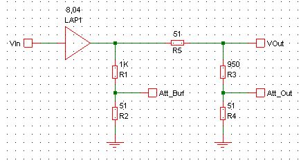 I suspect the TO speaks mainly German. So my answer written in German further back, first the translation made by DeepL: I assume that the following happens in the B-Amp 12: The two attenuators are resistor dividers with 50 ohm output impedance. They don't need to be T or Pi dividers. However, the load and the change in output impedance must be compensated by making the series resistance and gain slightly larger. The circuit shows estimated values, an exact calculation is more complex. There is of course a feedback from the Att_Out to the VOut. The high attenuation is chosen so that it can be neglected. Otherwise another buffer would be necessary. ------------------------- Ich vermute, der TO spricht hauptsächlich Deutsch. Also meine in Deutsch geschriebene Antwort weiter hinten, zuerst die von DeepL erstellte Übersetzung. Ich nehme an, dass im B-Amp 12 folgendes passiert: Die beiden Abschwächer sind Widerstands-Teiler mit 50 Ohm Ausgangsimpedanz. Das brauchen keine T- oder Pi-Teiler zu sein. Allerdings muss die Belastung und die Änderung der Ausgangsimpedanz dadurch kompensiert werden, dass der Längswiderstand und die Verstärkung etwas größer werden. Die Schaltung zeigt Schätzwerte, eine genaue Berechnung ist aufwändiger. Es gibt natürlich eine Rückwirkung vom Att_Out auf den VOut. Die hohe Dämpfung ist gewählt, damit sie vernachlässigt werden kann. Andernfalls wäre ein weiterer Buffer erforderlich.